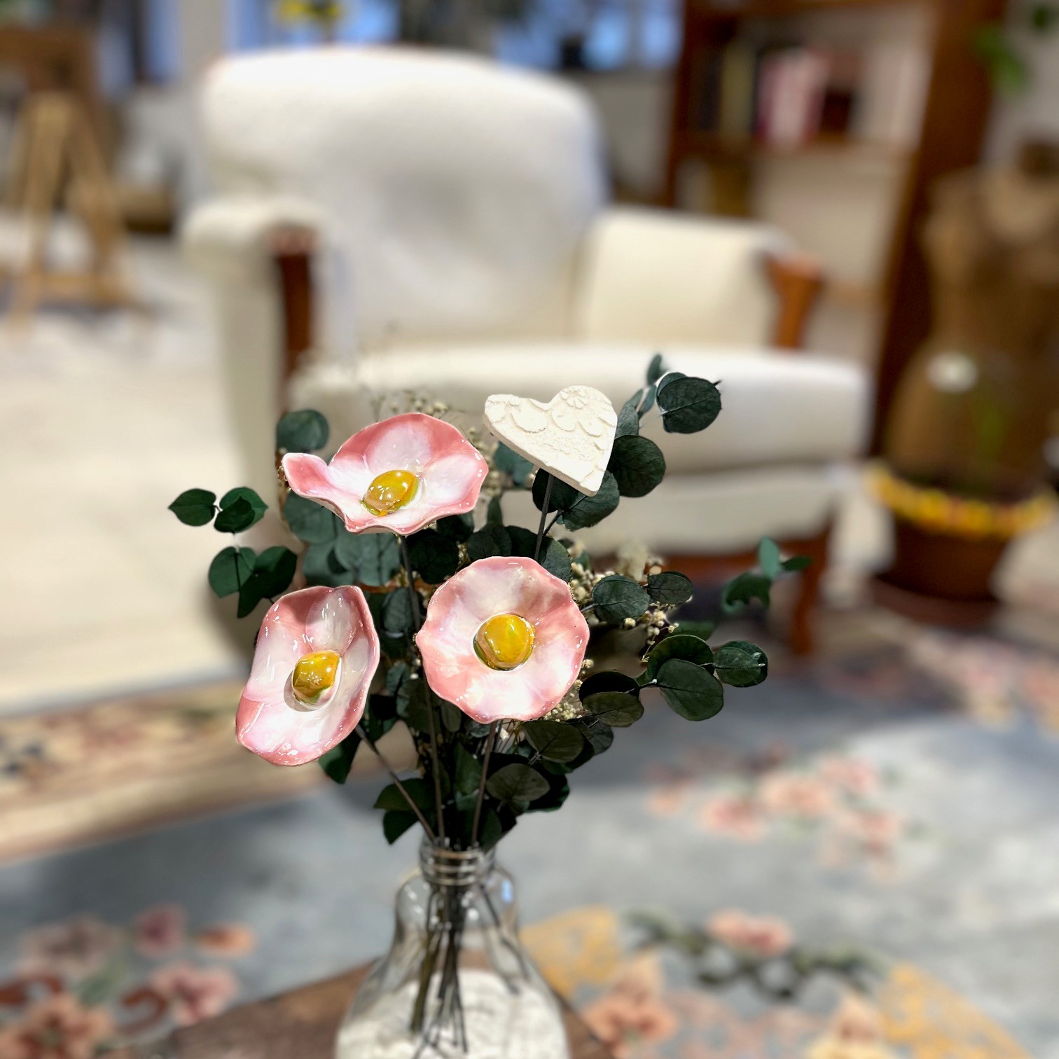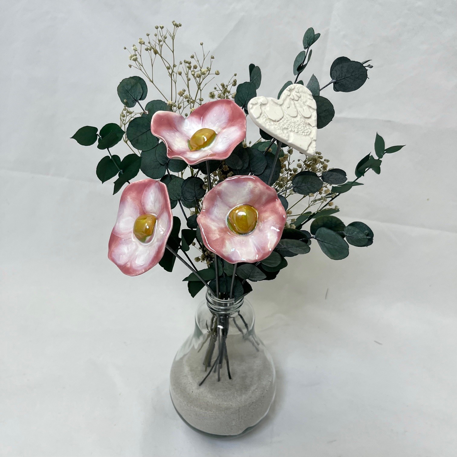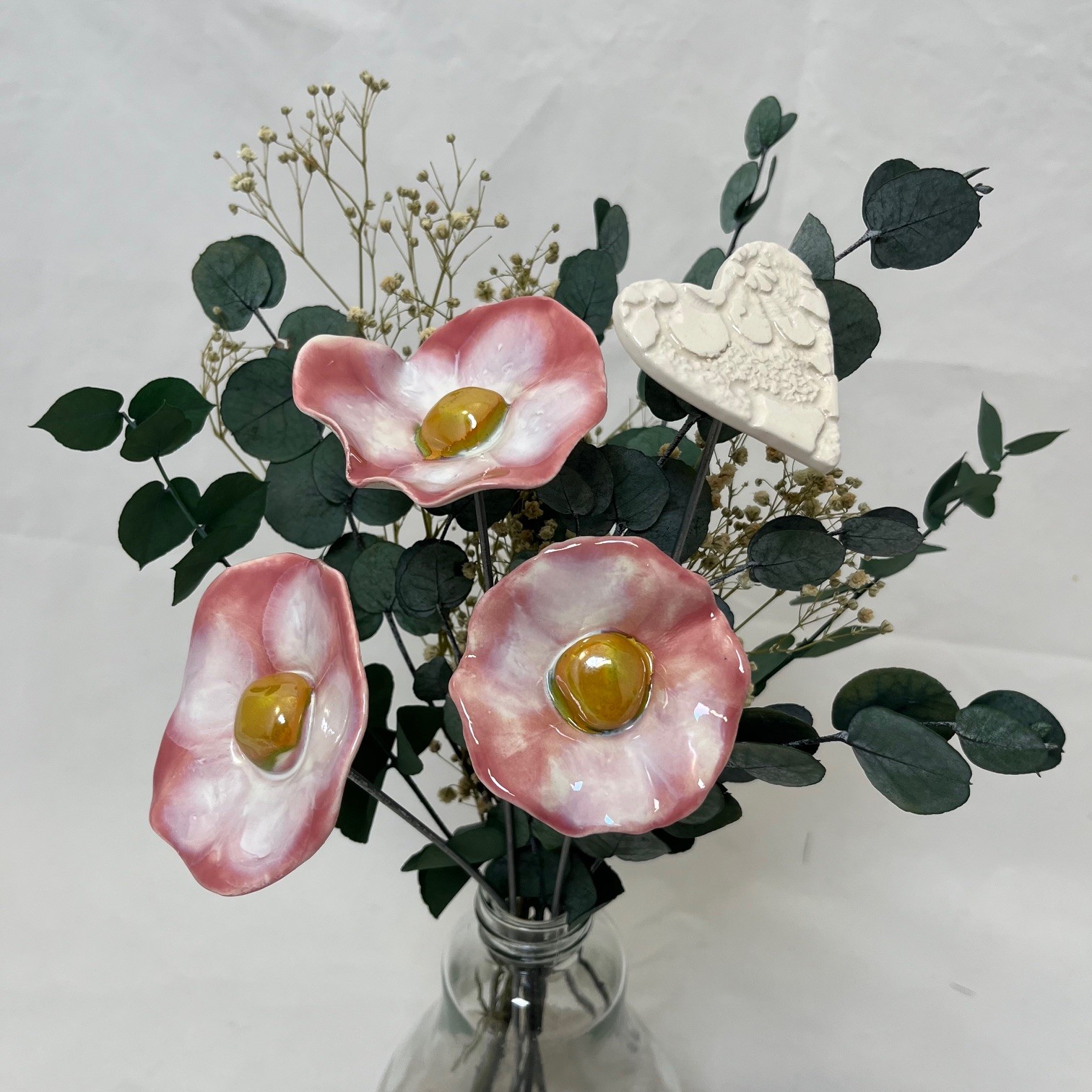 Les coquelicots en céramique mesurent entre 6 et 7 cm de diamètre sur des tiges de 35 cm de haut.