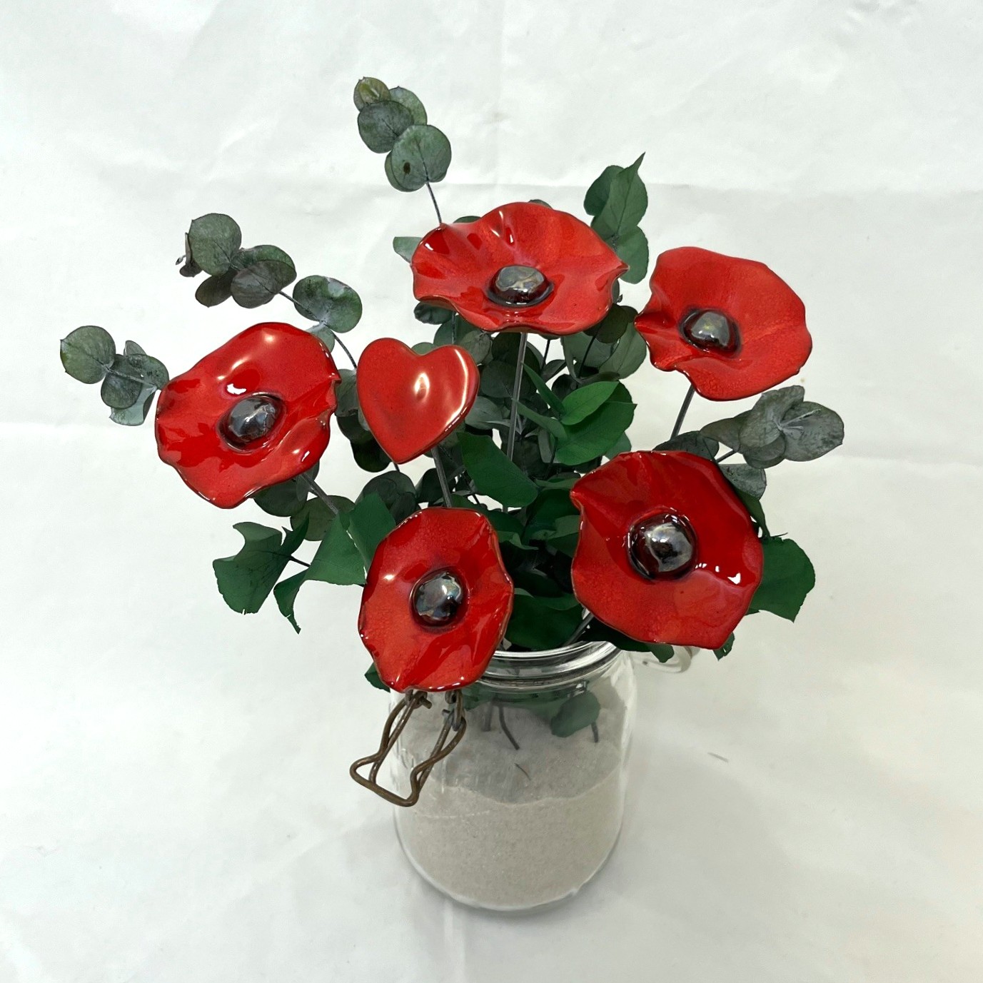 Bouquet composé de 5 petits coquelicots rouges nuancés cœur vert lustré, 1 petit cœur rouge et quelques feuillages stabilisés du moment.