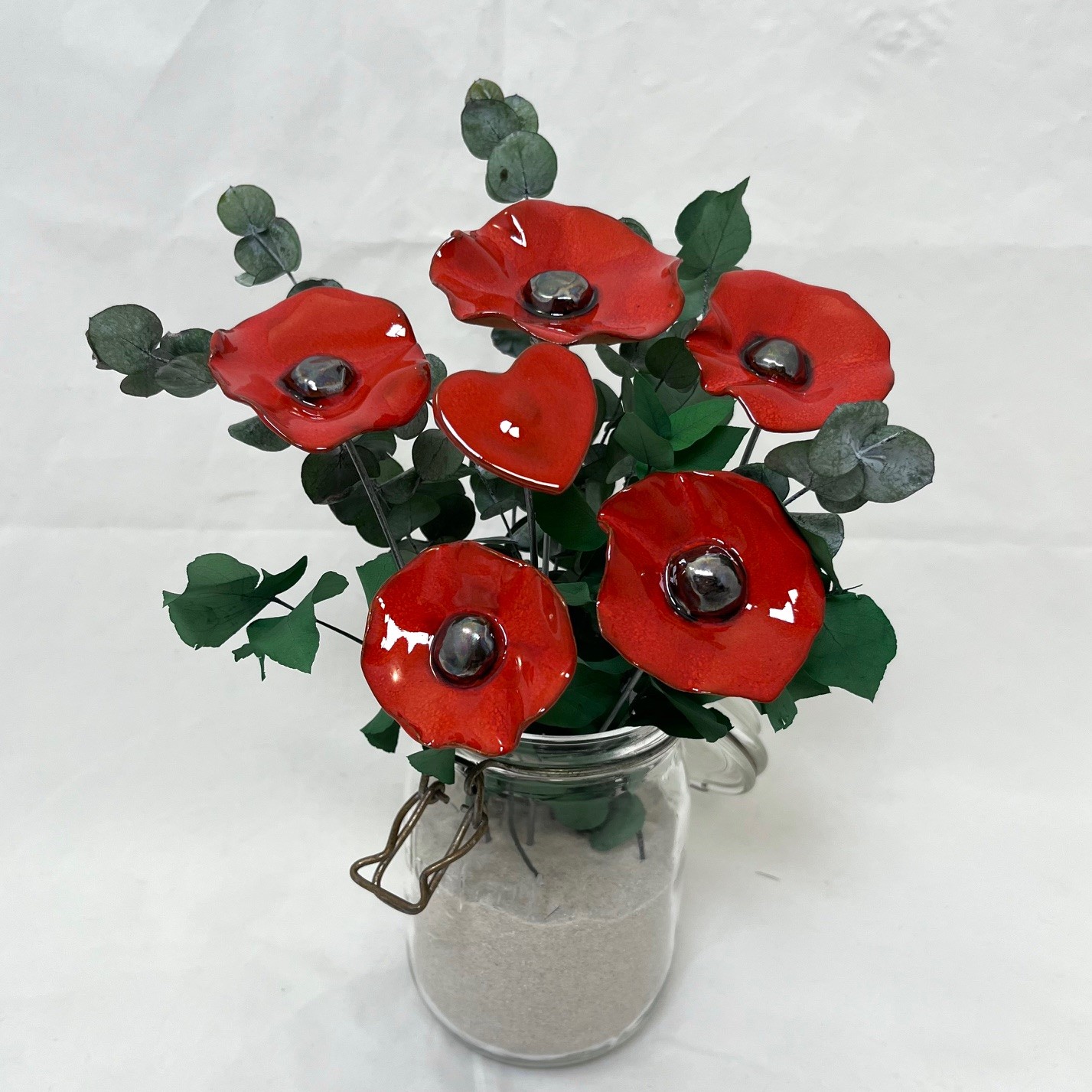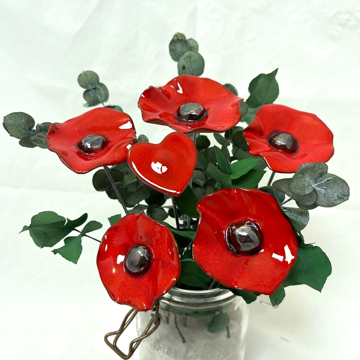Les coquelicots en céramique mesurent entre 6 et 7 cm de diamètre sur des tiges de 30 cm de haut.